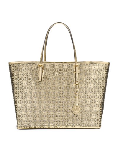 MICHAEL Michael Kors MK Flower Perforated Medium Travel Tote (Gold) have many advantages, Insta-glam metallic leather shapes this luxe, travel-ready tote detailed with pretty floral perforations. Spacious, pocket-lined with elegant straps, it's ideal for transatlantic treks or trips across town. From MICHAEL Michael Kors..
